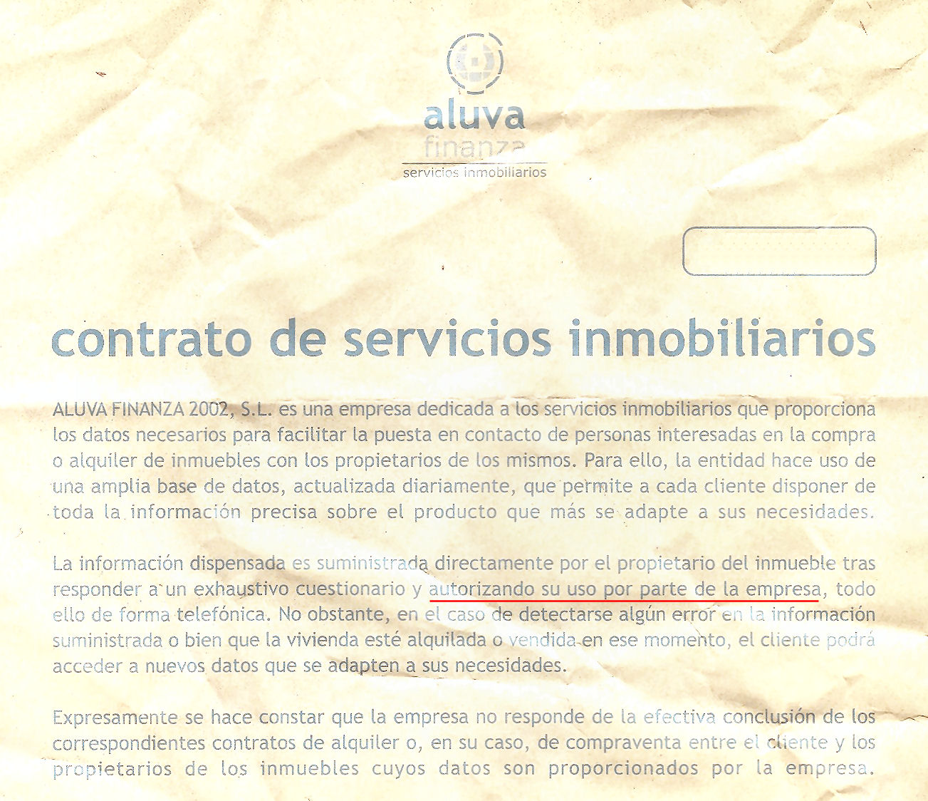 Y ahí es donde veo yo el error de esta gente, pues en el contrato que te hacen firmar, dicen: «La información dispensada es suministrada directamente por el propietario del inmueble tras responder a un exhaustivo cuestionario y autorizando su uso por parte de la empresa, todo ello de forma telefónica.»