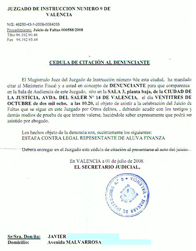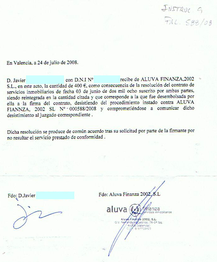 Independientemente de los testigos, denunciable es todo, otro tema que el juez de crédito cuando es la palabra de uno contra el otro. Si no es la primera denuncia que reciben, pueden considerarse indicios de fraude, y puede realizarse una investigación o tomarse ciertas medidas incómodas hacia ellos. Por poner un ejemplo: si alguien te vende unos calcetines en la calle bajo la promesa de que brillan en la oscuridad, y luego no brillan, tú le puedes denunciar, ya sea que te lo prometió de palabra sin quedar por escrito. Seguramente en el juicio tú explicarás lo que te prometió, y él lo negará. Si esta persona ya ha recibido antes otras denuncias similares, aunque nunca se llegó a demostrar, el juez puede tomar medidas cautelares, iniciar una investigación, o resolverse (extrajudicialmente) que la policía siga de cerca las actividades de ese sujeto. Lógicamente no va a hacer eso con alguien que vende calcetines, pero sí puede hacerlo con Aluva habiendo indicios de estafa inmobiliaria. Y no sé por qué me da que no es la primera denuncia de este tipo que reciben (ni será la última)… De hecho, una de las condiciones para devolverme el dinero fue la retirada de la denuncia, y esto es importante y olvidé mencionarlo, me exigieron que firmara una carta renunciando a exigir responsabilidades legales hacia la empresa en el futuro. Y que les enviara por fax una copia del comprobante de que había retirado la denuncia que ya había realizado. Lo primero lo hice, lo segundo nunca llegué a hacerlo, me lo guardé como un as en la manga hasta ver qué decidía. Aunque nunca les mandé el comprobante, finalmente decidí retirarla, pese a que no se lo merecían, porque a diferencia de ellos yo sí que tengo palabra, y también porque no me apeteceía meterme en juicios una vez solucionado el tema. Sea como sea, la denuncia no les trajo indiferentes eso te lo aseguro.