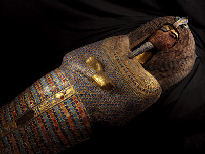 La elegante factura y el gran valor de los materiales empleados llevaron a relacionar este último con el segundo sarcófago interior de Tutankamón. Sin embargo, la cabeza no estaba adornada con el típico peinado funerario real, sino con una peluca idéntica a la de los vasos canopos. A los daños provocados por las infiltraciones de agua se había sumado el saqueo: la máscara de oro había sido arrancada, al igual que los cartuchos situados sobre las franjas de oro que envolvían el sarcófago.