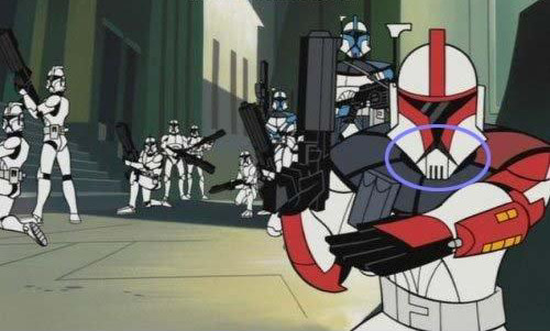 Star Wars, The Clone Wars: Los artistas digitales olvidaron colorear de rojo la zona de la barbilla del casco.
