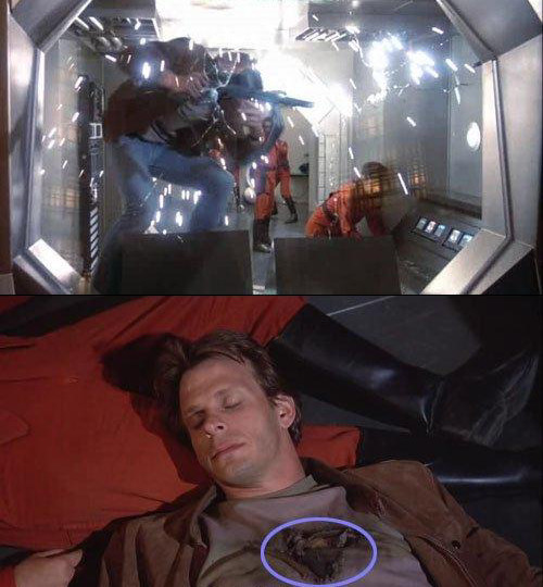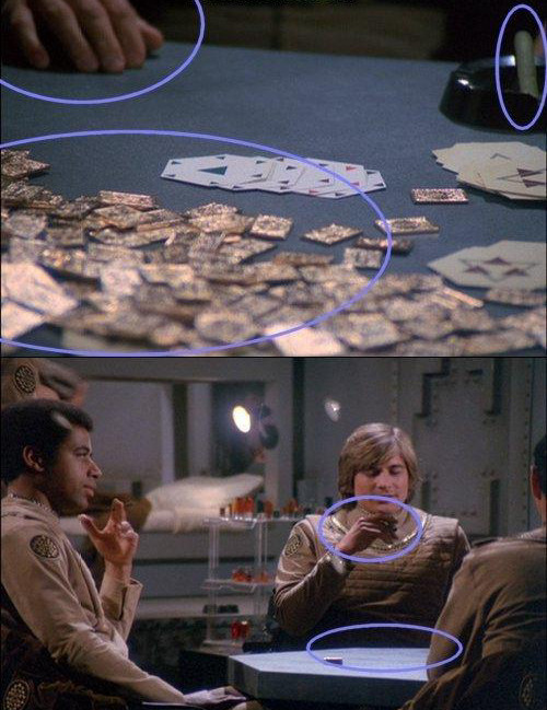 Battlestar Galactica (1978): La mano y el cigarro cambian de posición, las cartas y las monedas desaparecen.