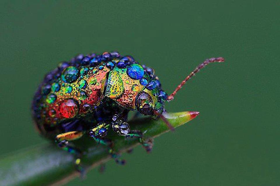La belleza de la mañana a cargo de un escarabajo de colores con las gotas de agua del rocío nocturno.