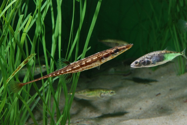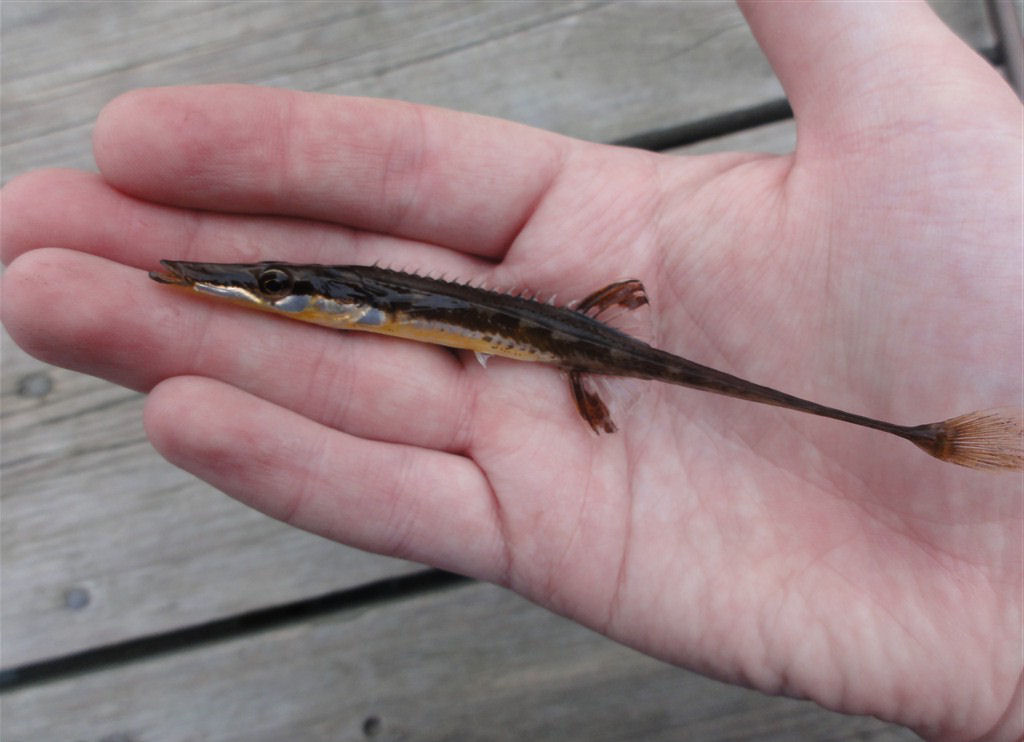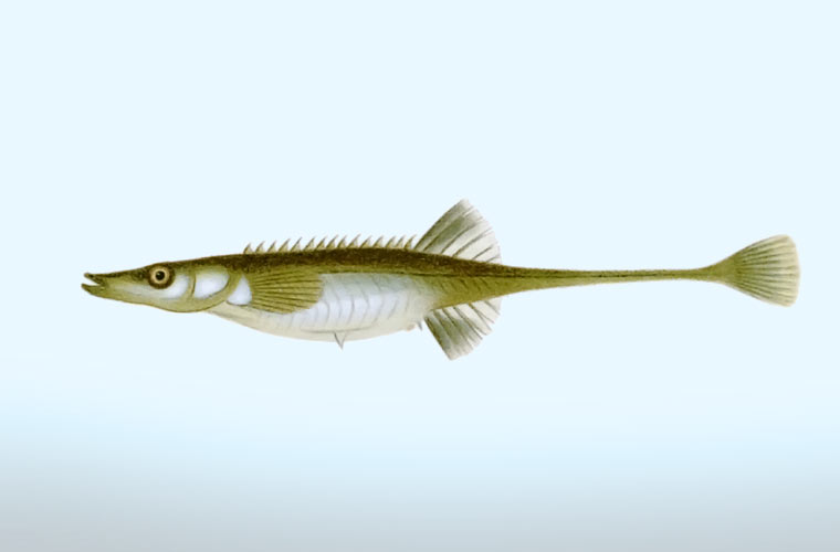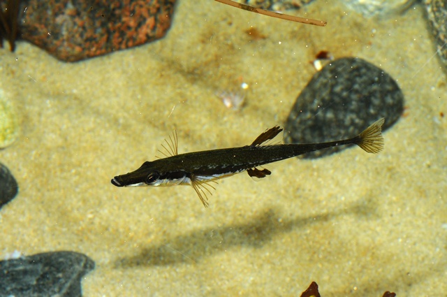 También es usual que las aletas pélvicas estén formadas por espinas exclusivamente. La segunda aleta dorsal y la aleta anal tienen tamaños parecidos y se encuentran justo antes del prolongado pedúnculo caudal. Su boca se halla en el extremo de su largo hocico. El color del dorso tiene tonalidades amarillas y marrones, mientras que sus flancos presentan marcas indistintas de color oscuro. Por el contrario, su abdomen es de color blanco y plateado.
