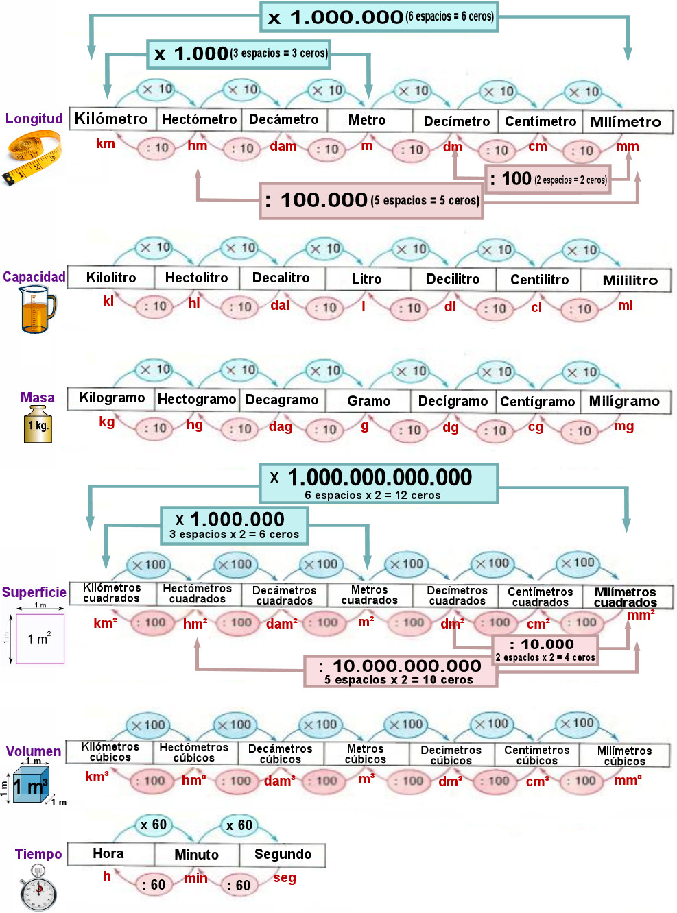 Aparte de aparecer los nombres de cada unidad, también figuran los símbolos de cada una en rojo y un croquis para conocer las operaciones matemáticas que hay que realizar para convertir cada unidad en otra.