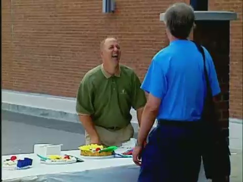 En un puesto de muestra de tartas, vemos cómo se ofrece cortar trozos de tarta a las pobres víctimas, y la gente se lleva unos sustos mayúsculos cuando comprueban que la tarta está vivita y coleando.