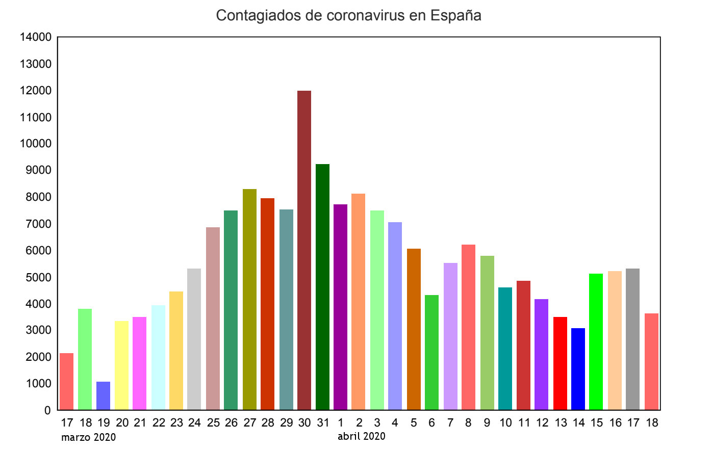 Vamos a ver la evolución del número de contagiados de coronavirus en España en una gráfica de barras. Corresponde al periodo que llevo yo registrando los datos en este sitio web (desde el 17 de marzo), entre los meses de marzo y abril de 2020.