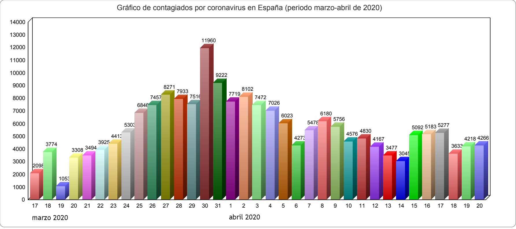 Vamos a ver la evolución del número de contagiados de coronavirus en España en una gráfica de barras. Corresponde al periodo que llevo registrando los datos en este sitio web (desde el 17 de marzo), entre los meses de marzo y abril de 2020.