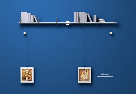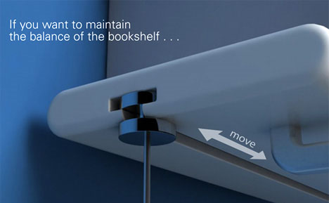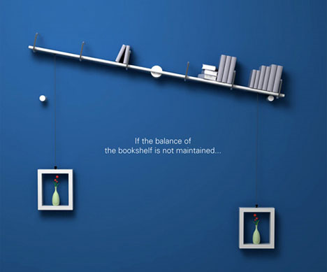 Estantería balancín. Con esta repisa, coger un libro supondrá la emoción de saber hasta qué punto desestabilizará la estantería. Según haya peso en una parte u otra, la estantería se irá hacia un lado u otro. Aun así, existen dos topes para que la cosa no vaya a un punto extremo. También podemos correr los puntos de equilibrio para poder centrar a nuestro gusto la repisa.