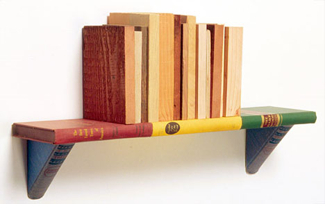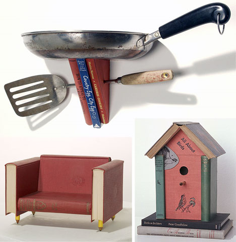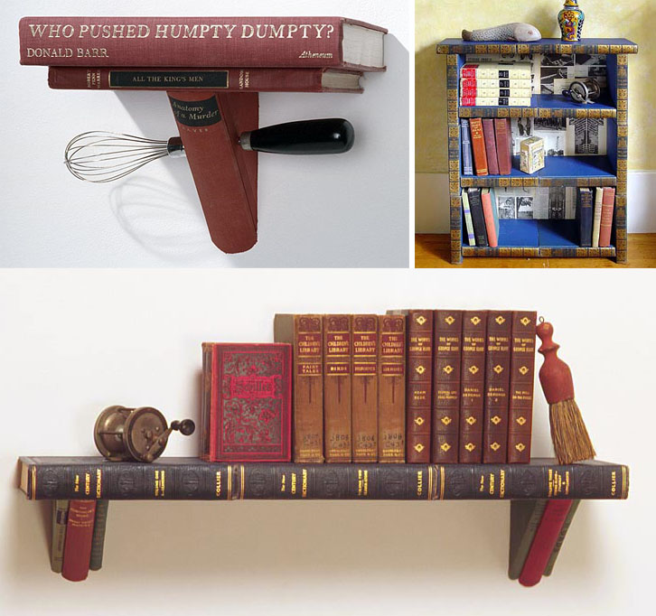 Repisas recicladas y reinventadas a partir de otros libros, que en algunos casos, los títulos del lomo nos cuentan una historia. Más allá de sostener libros, algunas veces nos sirven para contener objetos, o en vez de ser estanterías, pasan a tener diferentes formas.