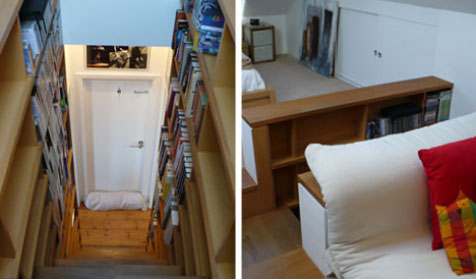 Biblioteca con escaleras dos en uno. Una idea estupenda para ahorrar espacio, es aprovechar las escaleras que conectan dos plantas para integrar una biblioteca. Una ventaja de esto, es que no existen estanterías inaccesibles por ser altas.