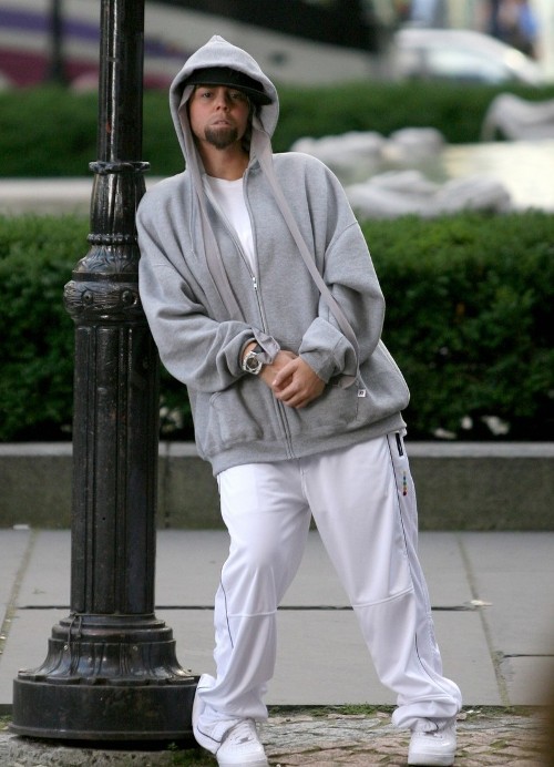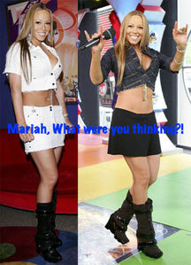 Y ahora el tema de los estilismos… Mariah, cariño, no se puede salir a la calle de esta guisa. En la imagen de abajo, ocultándose con la rebeca de la tia Nicanora.