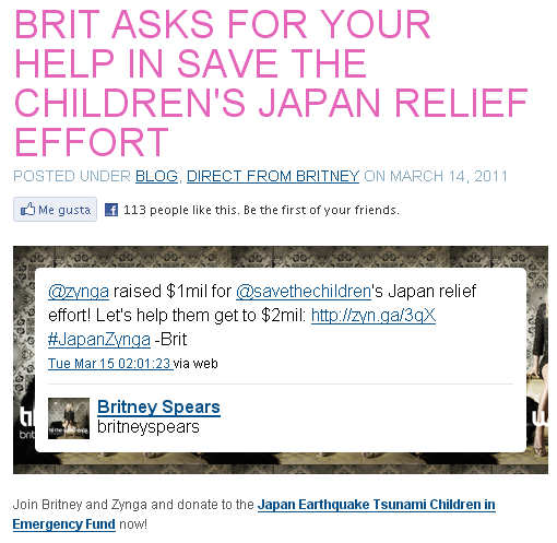 Britney Spears quiere que donéis en Zynga para los damnificados del terremoto.