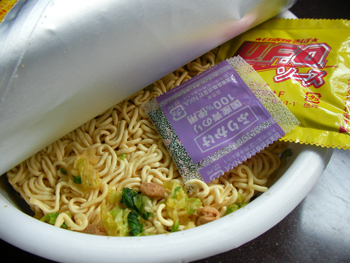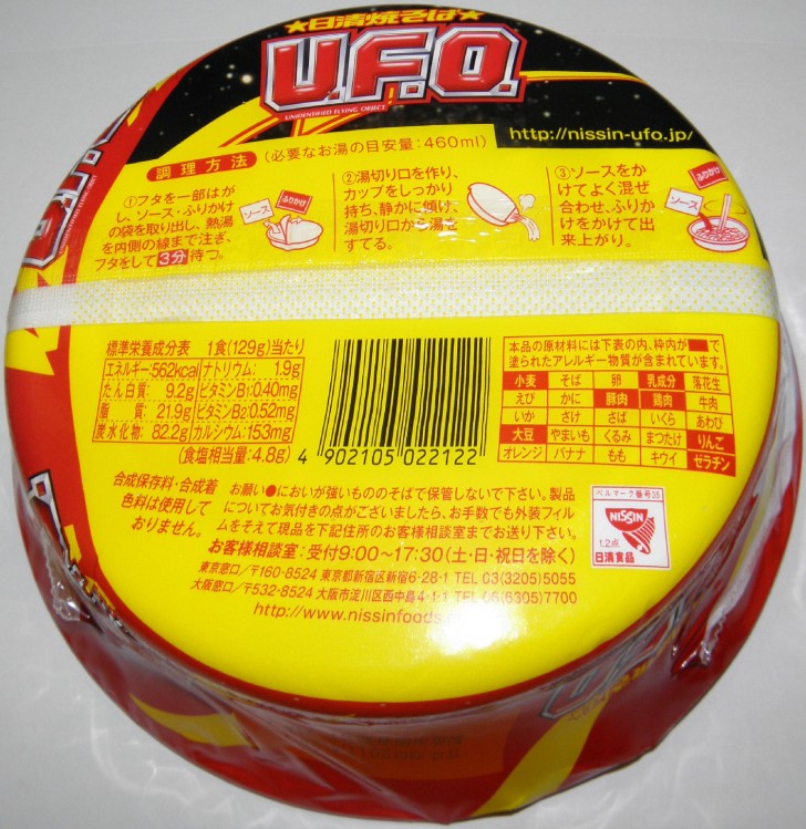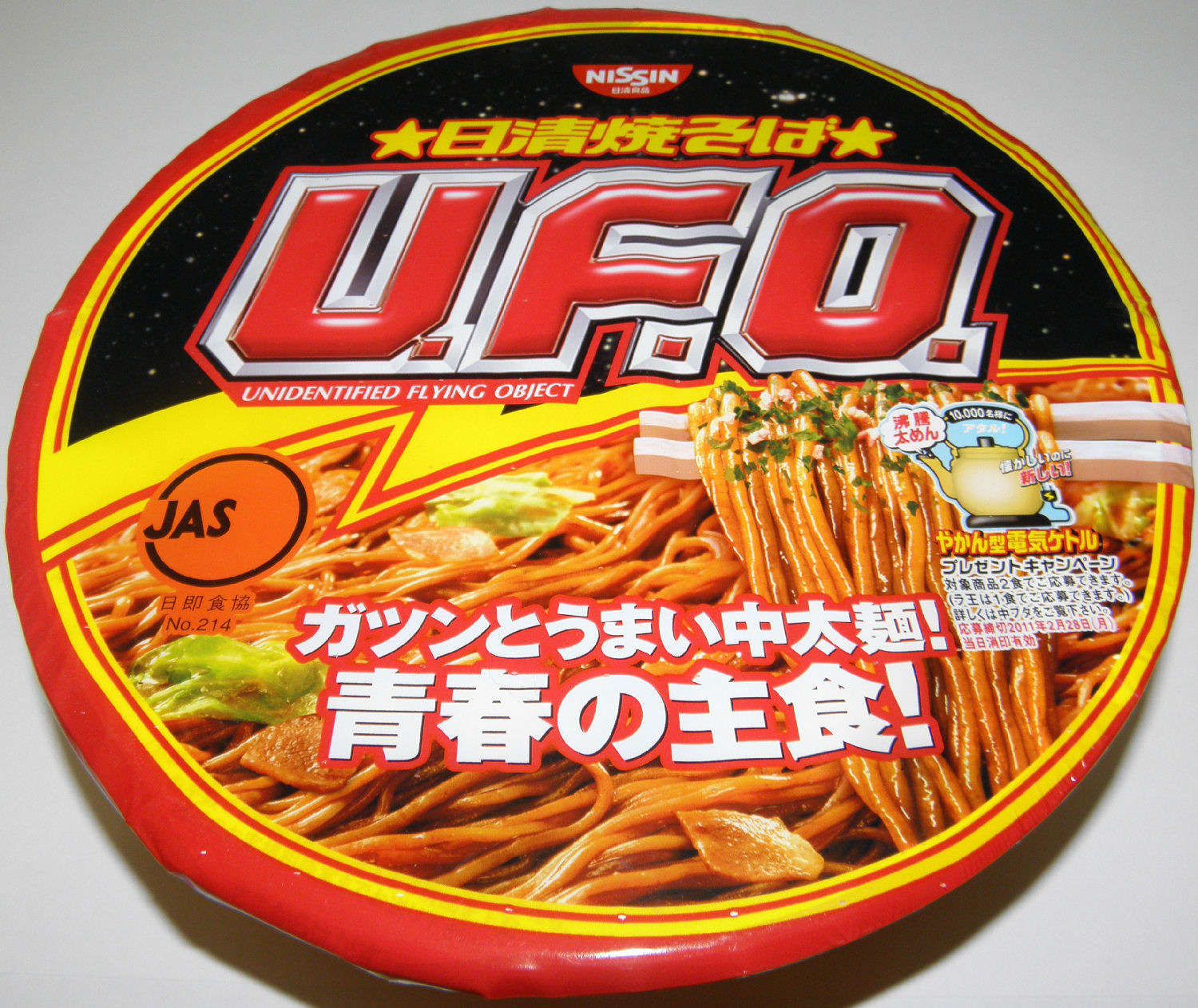 Estos fideos instantáneos de la marca U.F.O. (ovni) son de tipo soba y los fabrica la empresa Nissin, me los envió Fani desde Japón. No sé a qué viene lo del extraño nombre de «objeto volante no identificado», pero parece ser lo bastante famoso como para que se le haya hecho un juego flash: «Soba UFO»