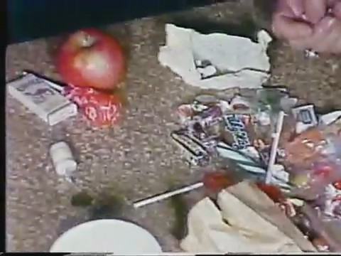 Luego aparecen haciendo recuento de las golosinas conseguidas y se puede ver… ¿una manzana? Pues sí que eran sanas las chuches. Tanto el niño como la niña reciben sendas manzanas, aunque me pregunto porqué el niño la agita para hacerla sonar ¿Qué esperaba que hubiera dentro? También se dedican a filmar a los niños que hacen lo mismo yendo a su casa a pedir golosinas, y podemos ver los disfraces tan apañados que se hicieron.