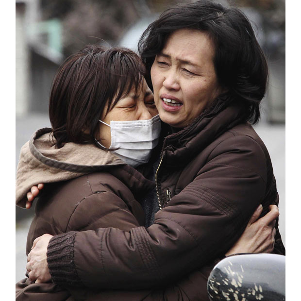 Unas hermanas se abrazan al encontrarse en un refugio de Minamisanriku tras pasar varios días de desesperación después del terremoto.