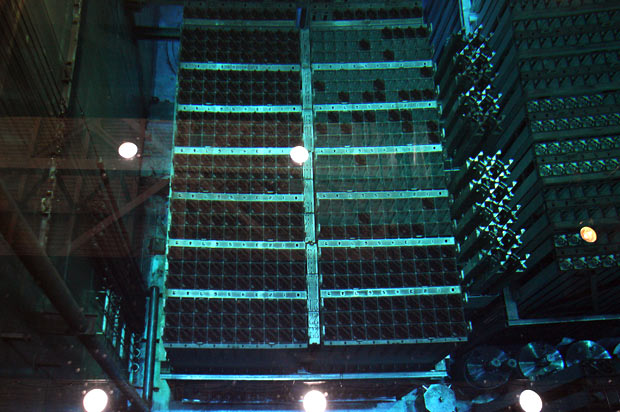 Departamentos en canal que contienen la mezcla de óxido de uranio-plutonio en barras, metidas en la piscina dentro del edificio que alberga el reactor nº3 de la central nuclear Fukushima Dai-ichi.