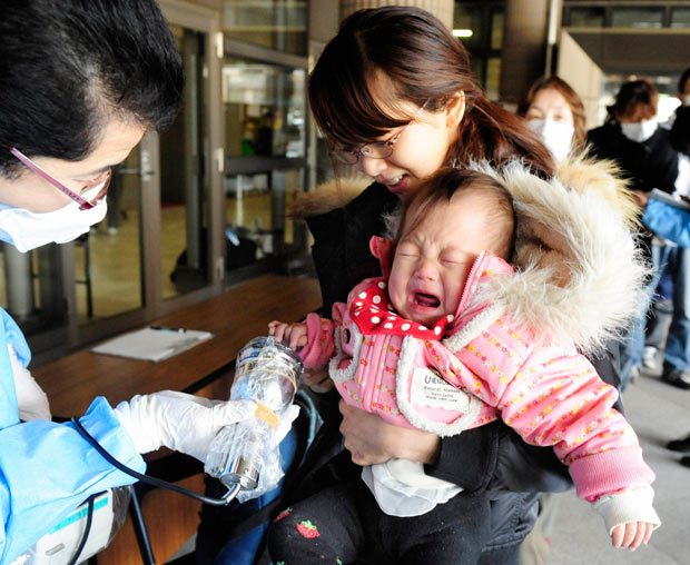 Un bebé y su madre son escaneados para detectar sus niveles de radiación antes de entrar en un centro de evacuación en la prefectura de Fukushima.