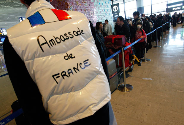 Residentes franceses en Japón hacen cola para poder subir en un vuelo especial a París desde el aeropuerto de Narita, Tokio. El gobierno francés declaró que Japón estaba perdiendo el control sobre la situación en la central nuclear Fukushima I y urgió a los franceses a abandonar el país o dirigirse al sur de Japón.