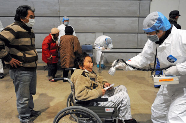 Personal médico japonés examina a una mujer evacuada de su casa que se encontraba cerca de la central nuclear Fukushima I.