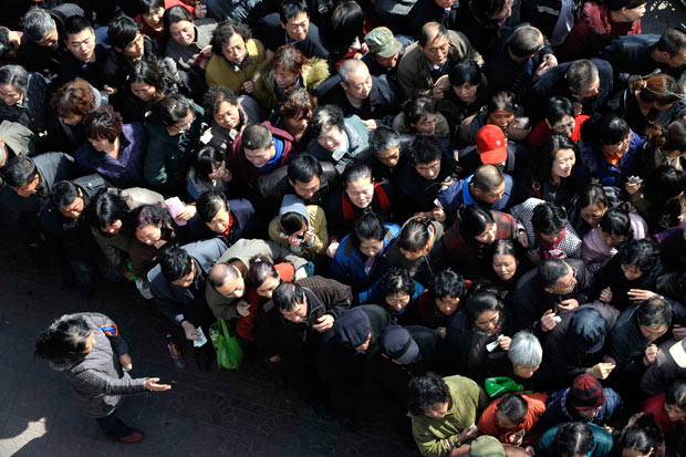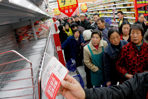 Compradores esperan que se repongan las existencias de sal frente los estantes de un supermercado en Huaibei, China. Se extendió el rumor de que la sal yodada ayudaba a evitar la contaminación por radiación nuclear y esto ha provocado auténticas mareas de compradores en varias ciudades chinas.