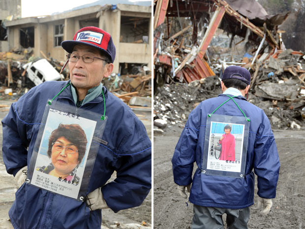 Kenji Sugawara lleva colgando del cuello la foto de su mujer mientras busca entre las ruinas y devastación de la ciudad de Otsuchi, en la prefectura de Iwate.