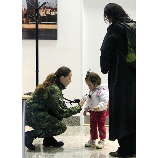 Una soldado emplea un dosímetro para escanear la radiación de una evacuada y su hija que han llegado desde Japón a un aeropuerto militar de Praga, en la República Checa.