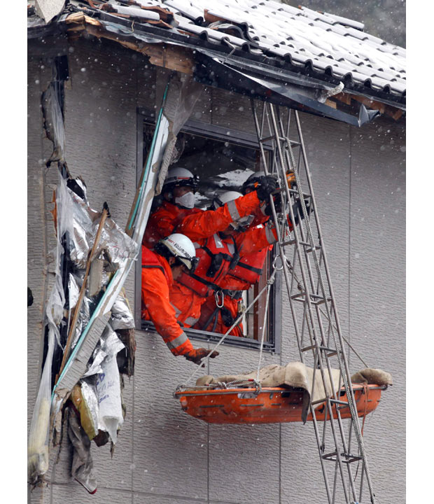 Unos bomberos descienden el cuerpo de una víctima en una vivienda de dos plantas que fue destruida por el terremoto y el tsunami en Kamaishi, al noreste de Japón. Los cuerpos de un hombre y tres mujeres se encontraron sin vida en la casa.
