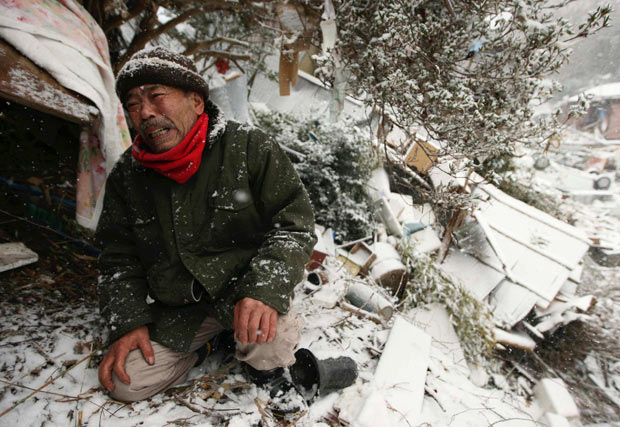 Un hombre llora al lado de su casa destruida en la que su madre permanece enterrada entre los escombros, en el pueblo de Onagawa, prefectura de Miyagi, un área gravemente asolada por el terremoto y posterior tsunami.