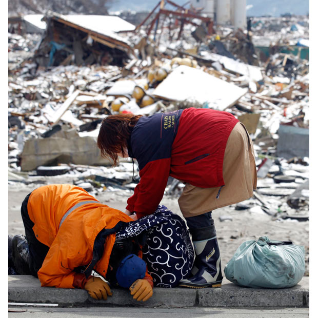 Yoshie Murakami llora mientras sostiene la mano de su madre fallecida que aparece entre los escombros, cerca del punto donde estaba su casa en Rikuzentakata, en la prefectura de Iwate. La hija de 23 años de Murakami continúa en paradero desconocido.
