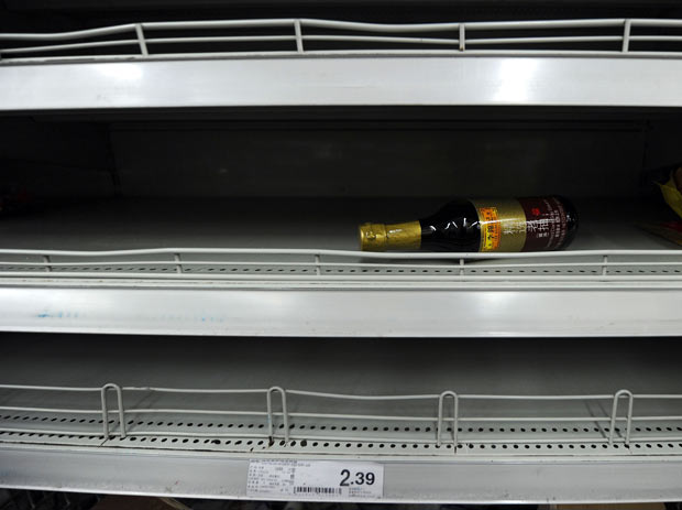 Un solitaria botella de salsa de soja permanece como testigo del terror consumista de comprar sal y salsa de soja en Beijing.