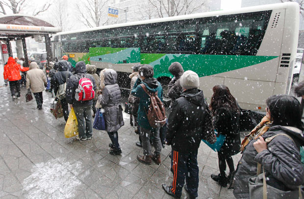 Gente esperando bajo la nieve para coger un autobús y partir de Sendai, abrumados por el desastre provocado por el terremoto.