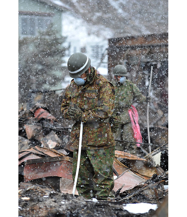 Un soldado de las Fuerzas de Autodefensa de Japón reza antes de retirar el cuerpo de una víctima del tsunami encontrada entre los escombros de la ciudad de Otsuchi, en la prefectura de Iwate.