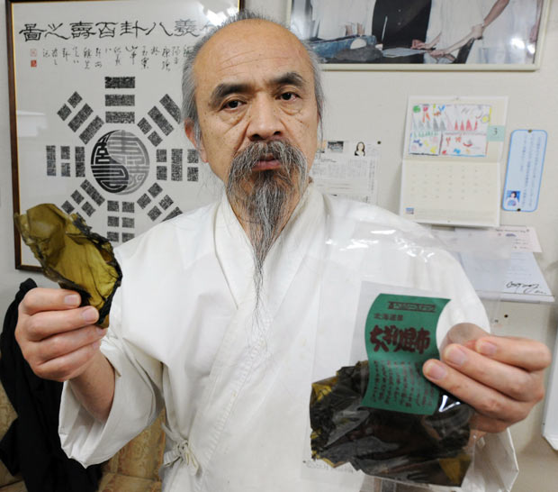 El maestro japonés en medicina oriental Takeuchi de Tokio, muestra unas hojas de alga kombu, las cuales recomienda a sus pacientes para evitar la asimilación de radiación.