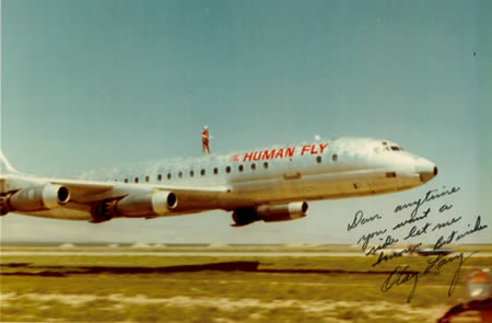 «La mosca humana«, un temerario especialista de acrobacias llamado Rick Rojatt, monta a lomos de un DC-8 que conduce el piloto Clay Lacy a 250 nudos en pleno desierto de Mojave, California. Esta foto fue tomada en 1970, durante la celebración del festival California 1000 Mile Air Race. Posteriormente, el personaje de Rick Rojatt pasó a ser un superheroe de ficción en los cómics de Marvel.