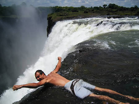A 100 metros de altitud en las cataratas Victoria, existe una especie de piscina natural formada por roca denominada «La piscina del diablo«, en la que el agua está relativamente en calma. Desde septiembre a diciembre, cuando el nivel del agua es bajo, se puede nadar en dicha piscina. Esta foto pone nervioso a cualquiera, y más sabiendo que las crecidas del rio pueden ser tan rápidas que en pocos minutos el caudal puede subir hasta un metro.
