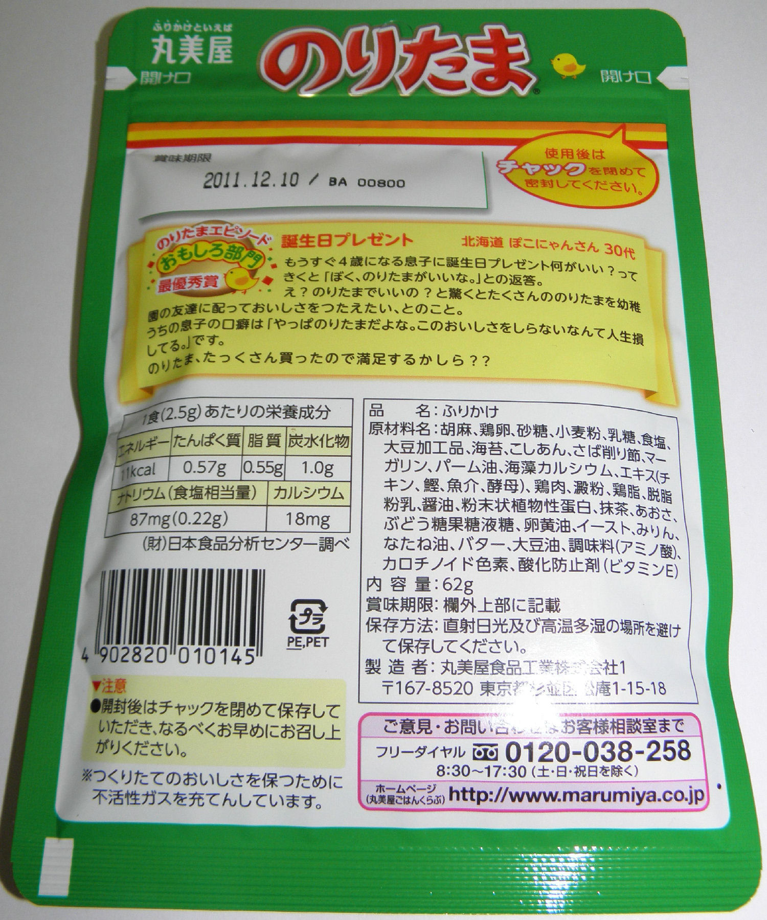 Este furikake de la marca Noritama es esencialmente de alga nori y huevo (qué risa la madre de los pollitos diciendo que contiene calcio «karushiumu» (leer a lo Chiquitito de la Calzada)). A mi no me gustó nada el sabor, ya que me resulta un poco asquerosillo el sabor a huevo tan presente que deja este condimento.
