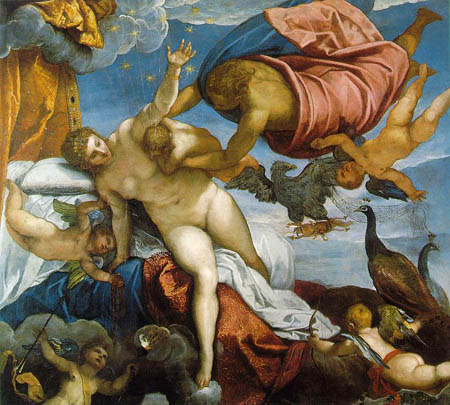 Hércules succiona con fruición la leche del pecho de Hera, esparciendo al apartarse un reguero de leche que forma la Vía Láctea.