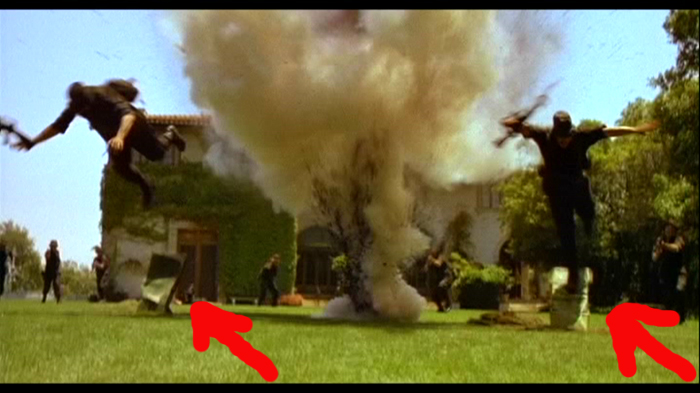 En esta película, podemos ver en una escena de acción, cómo Arnold Schwarzenegger lanza una granada. En el incidente, dos hombres salen catapultados con esta explosión. Y nunca mejor dicho, porque si aguzamos la vista, veremos que en realidad han sido lanzados al aire con la ayuda de dos catapultas, que aparecen fugazmente en la escena.
