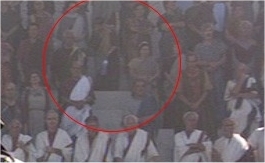 Un extra con ropas modernas entre la multitud del público.