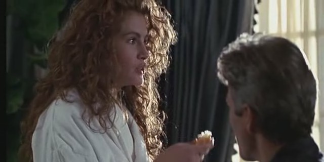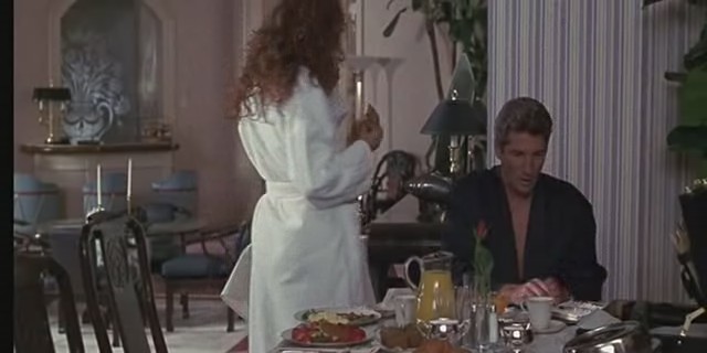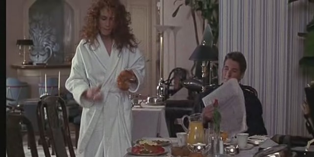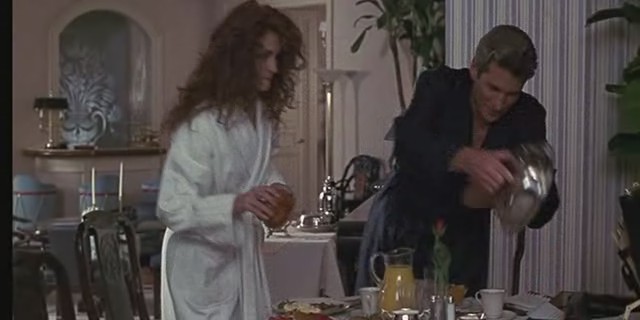 Un caso también famoso de gazapos, lo podemos encontrar en Pretty Woman (Puty Woman para los amigos). La escena del desayuno cuando han pasado la primera noche la Roberts y el Richard Gere (el de los ojillos chicos que le gustan las cosas esas del Dalai Lama) es de esas que hace historia, pero de pifia pastelera.