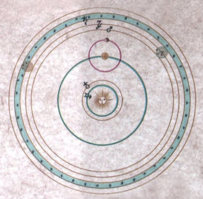 la Luna, Marte, Júpiter y Saturno) girando a su alrededor, cada uno situado en una esfera. Por último, situó la esfera de las estrellas fijas.