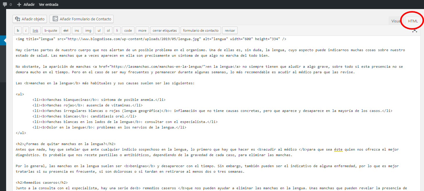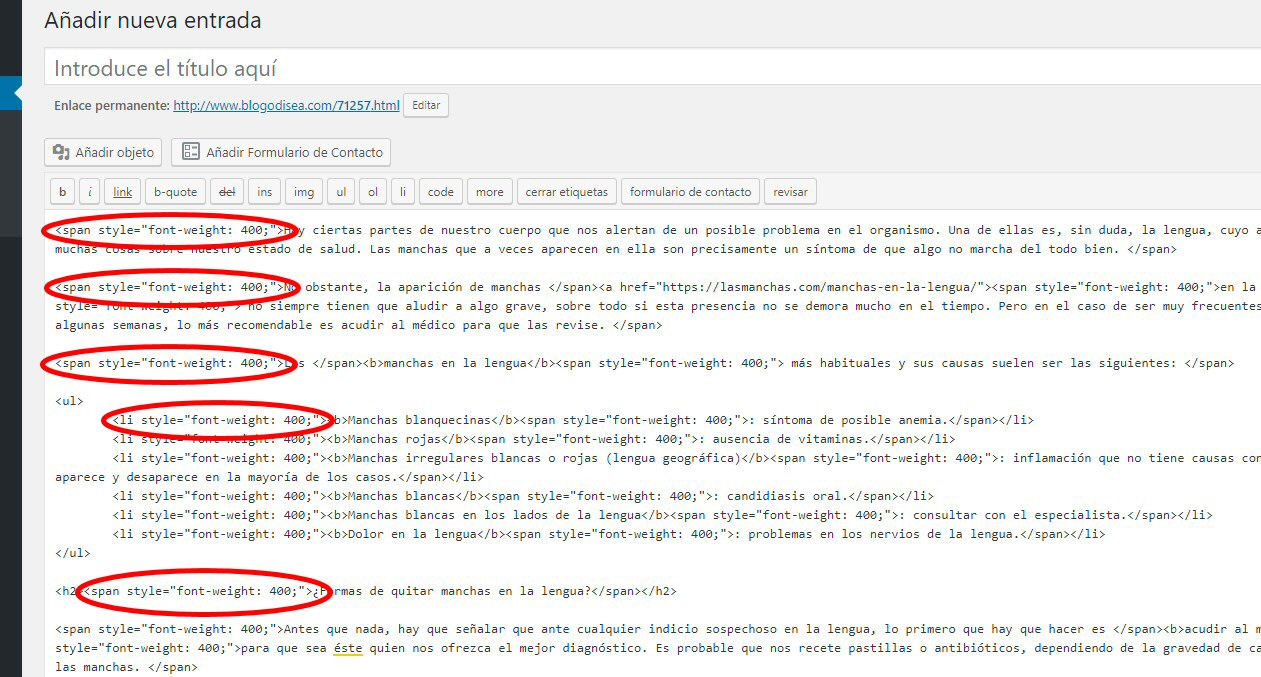3 – Ahora si pasamos al editor HTML (desconozco cómo se hacía en los editores de WordPress nuevos, sigo usando el antiguo de la pestaña HTML), veremos todo el código basura por doquier.
