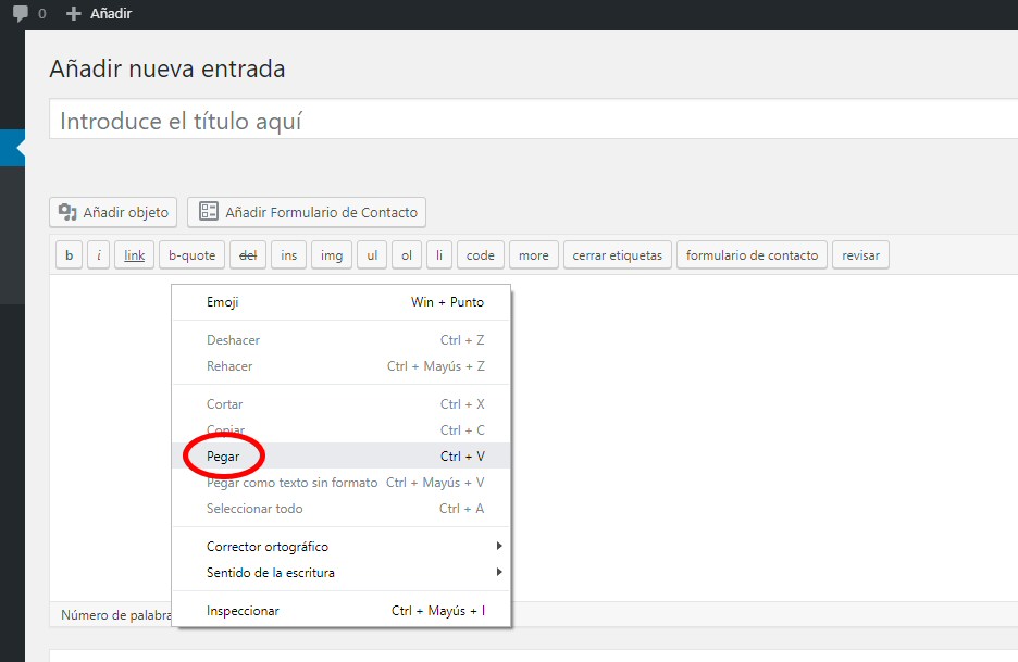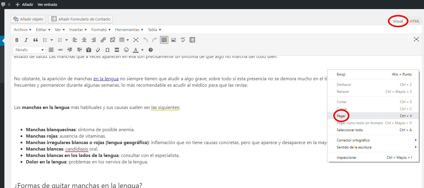 7 – Ahora volvemos al borrador de la misma entrada y borramos todo el texto que había. Y de nuevo, estando en la pestaña de VISUAL, pegamos el contenido del portapapeles.