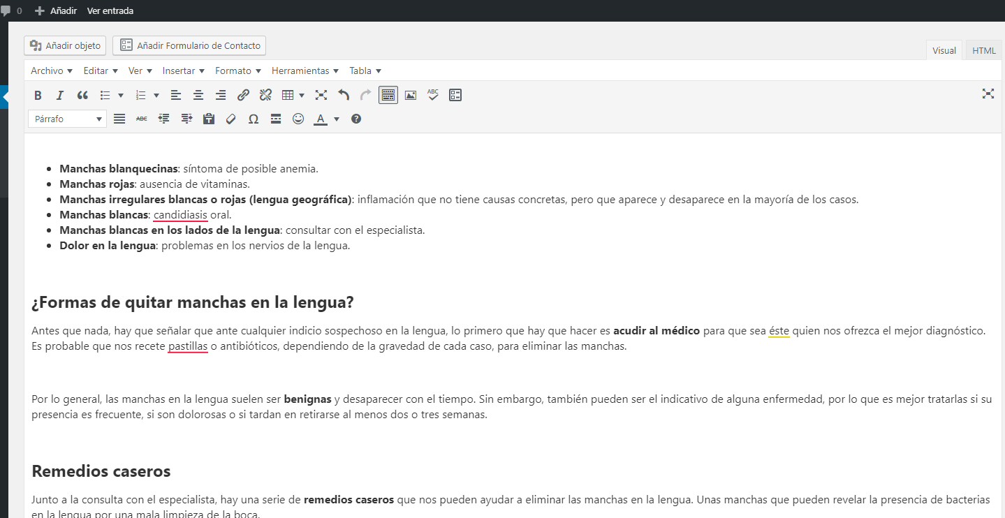 En el editor visual no se aprecia nada extraño en cuanto a código HTML innecesario.