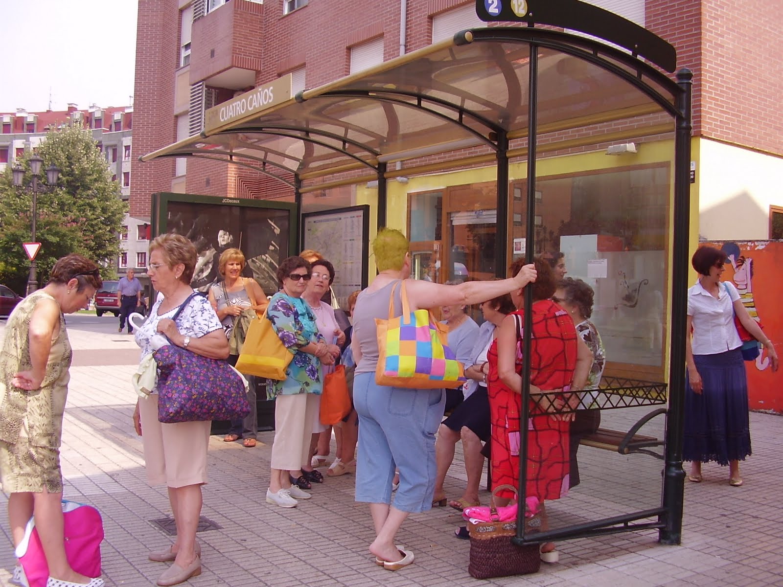 Señoras que no se conocen y se comentan indignadas lo que tarda el autobús.