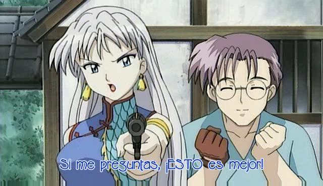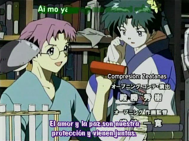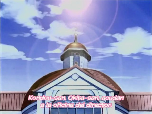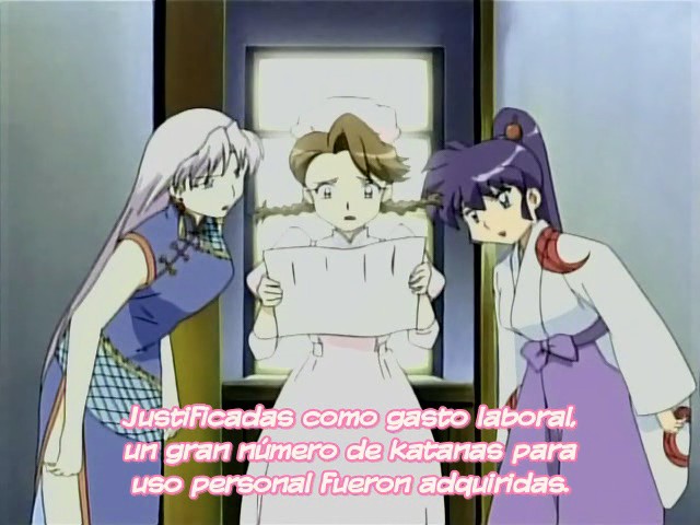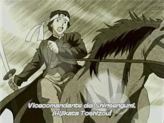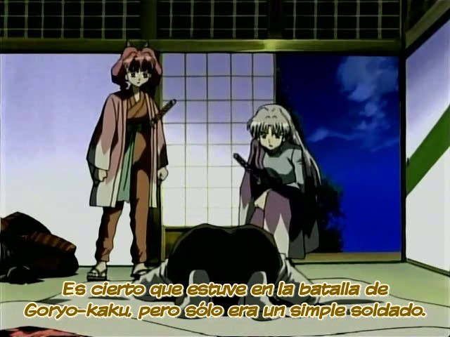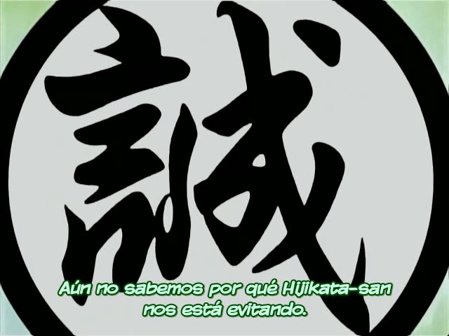 El último que vi fue el de Kidou Shinsengumi Moeyo Ken, del fansub Frozen-Layer, que clama al cielo. Primero, no entiendo esa manía de colorear los subtítulos según el color de pelo del personaje que hable, empleando si cabe, colores imposibles de leer, como rosa suave sobre blanco. Que conste que no es lo mismo ver estos vídeos en el ordenador, que en la tele, ya que en el ordenador se ven mejor, pero en la tele yo lo veo bastante peor, y encima con un fondo moviéndose detrás. Lo digo porque en las imágenes capturadas aun se pueden leer algo mejor que si lo viéramos en vivo.