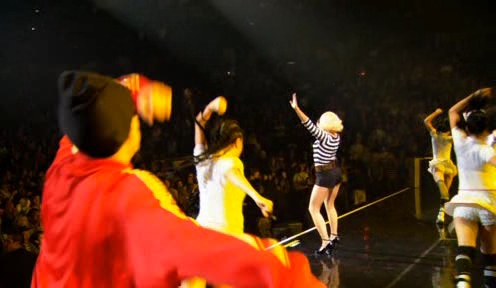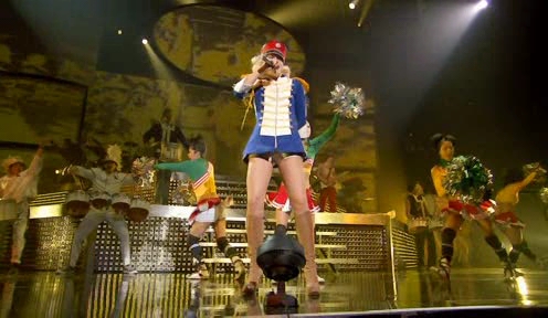 El siguiente bloque empieza con temas de su segundo disco. Aquí con «Wind it up» en un ambiente circense y de juguetes. La verdad que es una de las mejores puestas en escena en general.