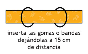 Ahora pasamos las cintas, gomas o bandas elásticas por el trozo de tela, dejándolas a una distancia de unos 15 centímetros entre sí.