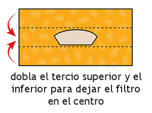 Colocamos el trozo de filtro de café, bolsa de aspiradora o tela en el centro de la tela principal. Luego doblamos el tercio superior y el tercio inferior hacia el centro.