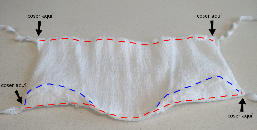 En mi caso, para darle una forma más recogida en las mandíbulas respecto a la zona de la barbilla, metí los picos laterales inferiores hacia dentro y los cosí, como veis en las líneas azules de la imagen de abajo. Pero eso era simplemente para que quedara un poco más bonito y con una forma más de mascarilla.